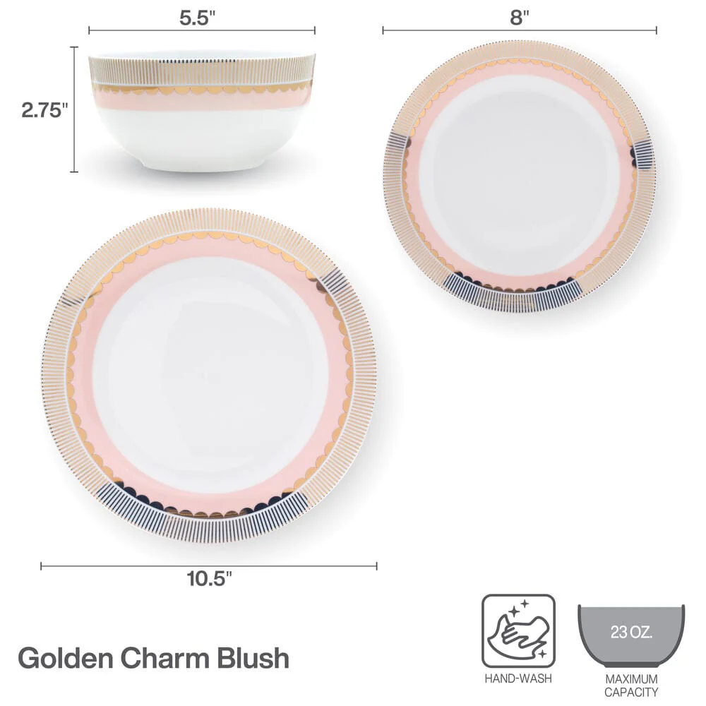 The Darbie Angell Brand not only creates beautiful tableware for your home, but empowers and employs women throughout the world, aiming to impact lives one table setting at a time. Entertain in style with this 12-Piece Blush Golden Charm Dinnerware Set. These stylish dinnerware pieces are adorned with lustrous gold and blushing pink details that bring a dazzling elegance to tables, making them perfect for both everyday dinners and special occasions.