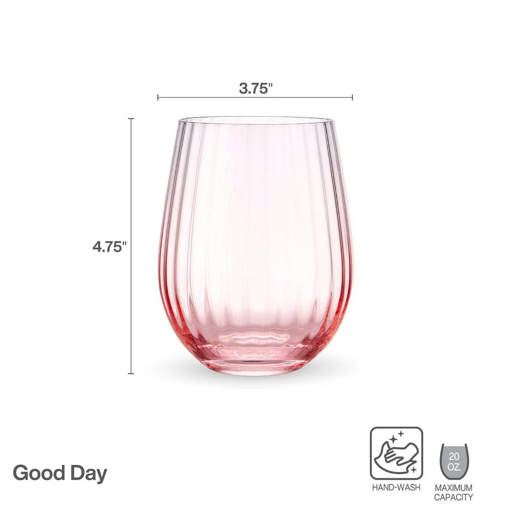 The Darbie Angell Brand not only creates beautiful tableware for your home, but empowers and employs women throughout the world, aiming to impact lives one table setting at a time. Entertain in style with this Set of 4 Blush Good Day Stemless Wine Glasses. These beautifully crafted glasses feature playful, colorful details that brighten up your table spread and make every sip a celebration. Pretty and practical, these elegant drinkware pieces are made of durable glass with an ombre blush design for long-lasting vibrancy.